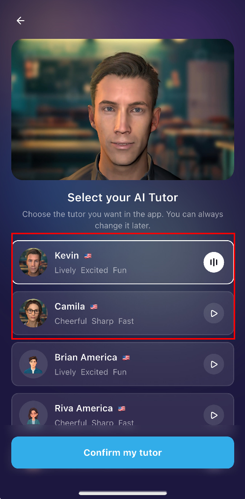 ELSA offers accents from two countries with distinct tones: American and British. You can choose any of these accents, available in different genders and tones, for the AI avatar that guides you through your lessons.