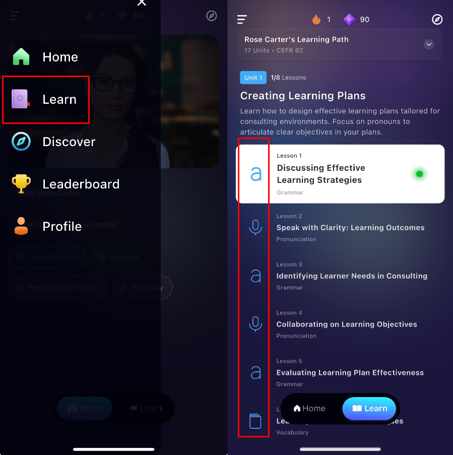 Currently, the accent preference you select is only applied to all AI-generated lessons in the Learning Path feature, including: