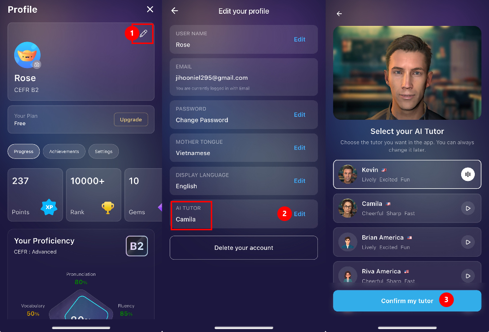 To change the tutor voice, please go to Profile tab > click Edit profile > then edit the Tutor Voice.