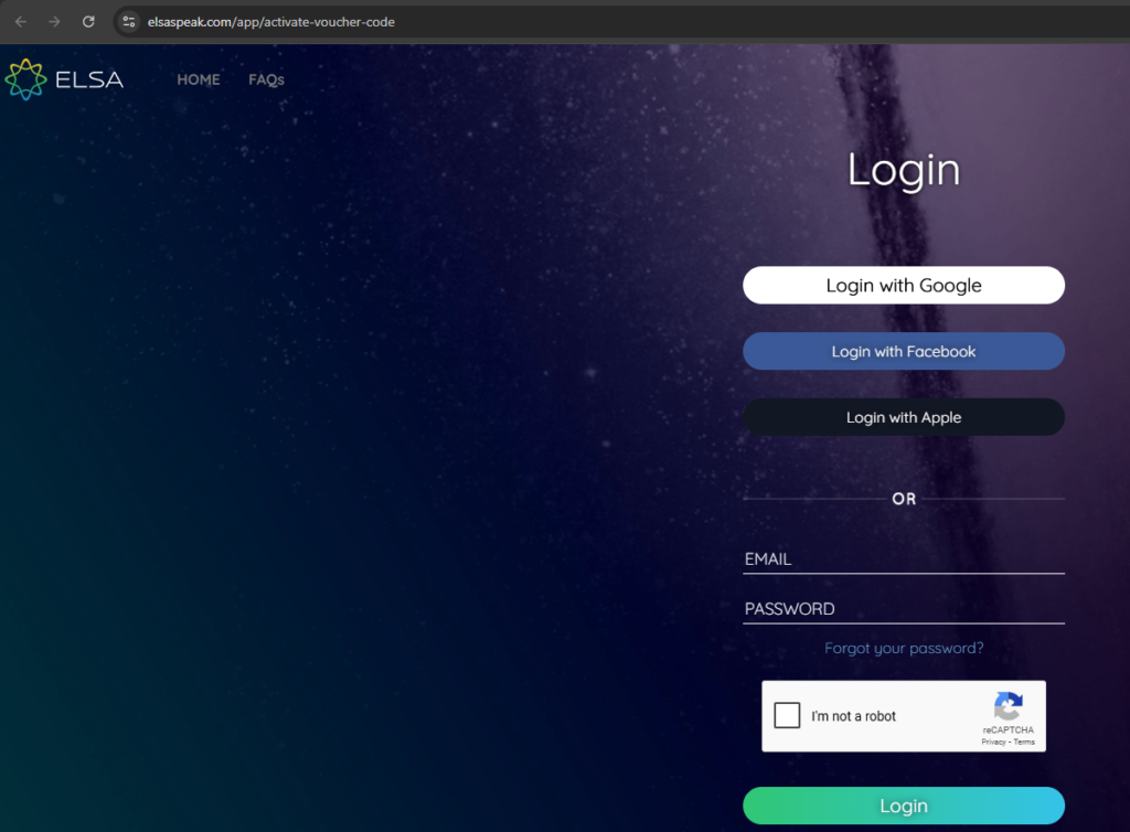Go to: https://elsaspeak.com/app/activate-voucher-code