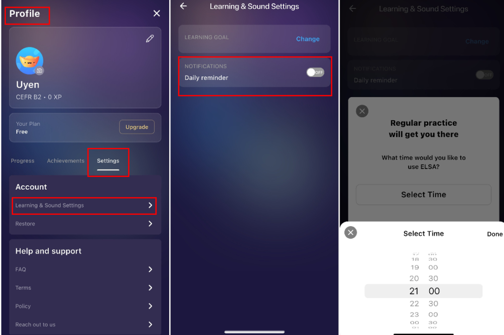 Solo necesitas ir a Configuración en la página de Perfil → Configuración de Aprendizaje y Sonido → Activar “Recordatorio diario” → Elegir la hora en que deseas usar ELSA. La app te enviará notificaciones diariamente a la hora seleccionada para recordarte estudiar. De esta manera, ELSA puede ayudarte a estudiar de forma regular y lograr un mejor progreso.