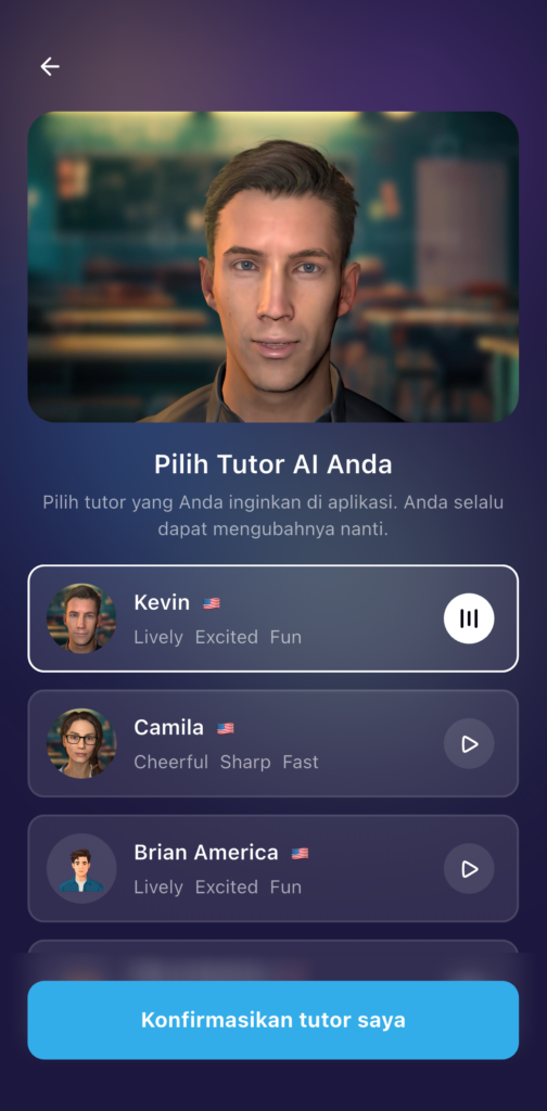 Selain itu, ELSA kini juga menghadirkan dua tutor 3D – Kevin dan Camila – yang dirancang untuk membuat pengalaman belajar Anda lebih realistis, interaktif, dan menyenangkan.