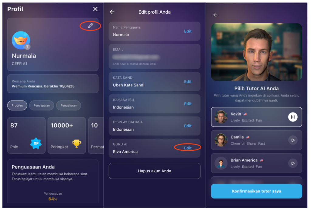 Untuk mengubah suara tutor, silakan buka tab Profil > klik Edit Profil Anda > lalu ubah Guru AI.