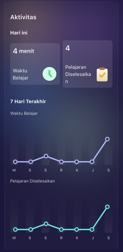 Waktu belajar dan total jumlah pelajaran yang sudah diselesaikan dalam 7 hari terakhir.