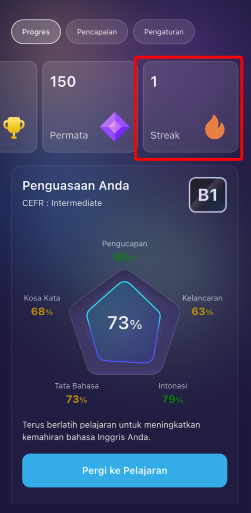 Pertahankan streak kamu dengan belajar minimal 1 pelajaran setiap hari.