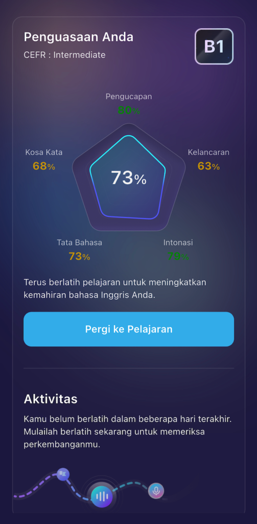 Lihat kemampuan kamu sekarang dan hasil keseluruhan dari 5 keterampilan: Pengucapan, Kelancaran, Intonasi, Kosakata, dan Tata Bahasa.