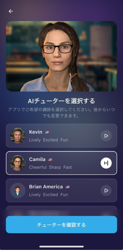 AIチューターとやり取りする際に、さまざまなアクセントや声の性別から選択でき、学習体験をさらに向上させることができます。