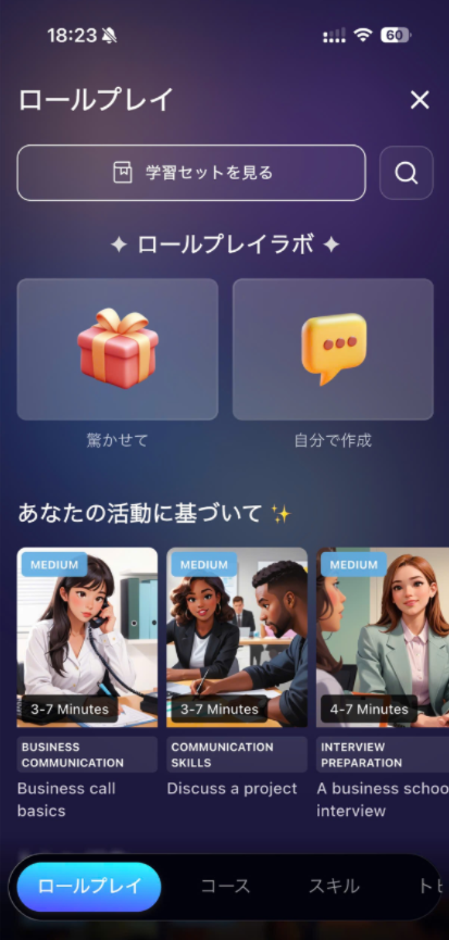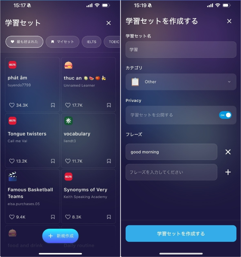 学習セットでは、自分で作成した特定の単語やトピックに集中して学習でき、重要な内容を効率的に復習・練習できます。