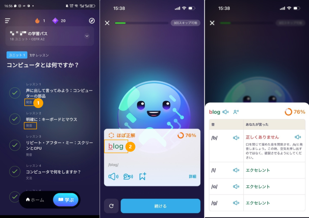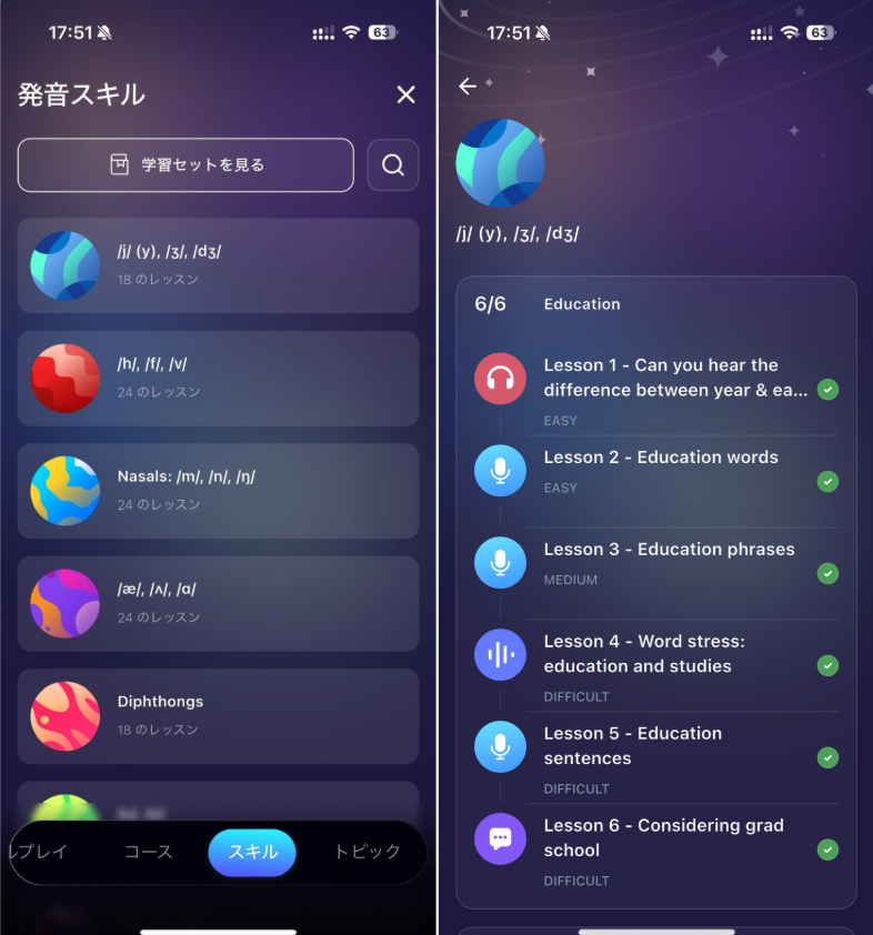 レッスンは発音ごとにグループ化されており、最も改善が必要な発音の分野に集中して学習できます。