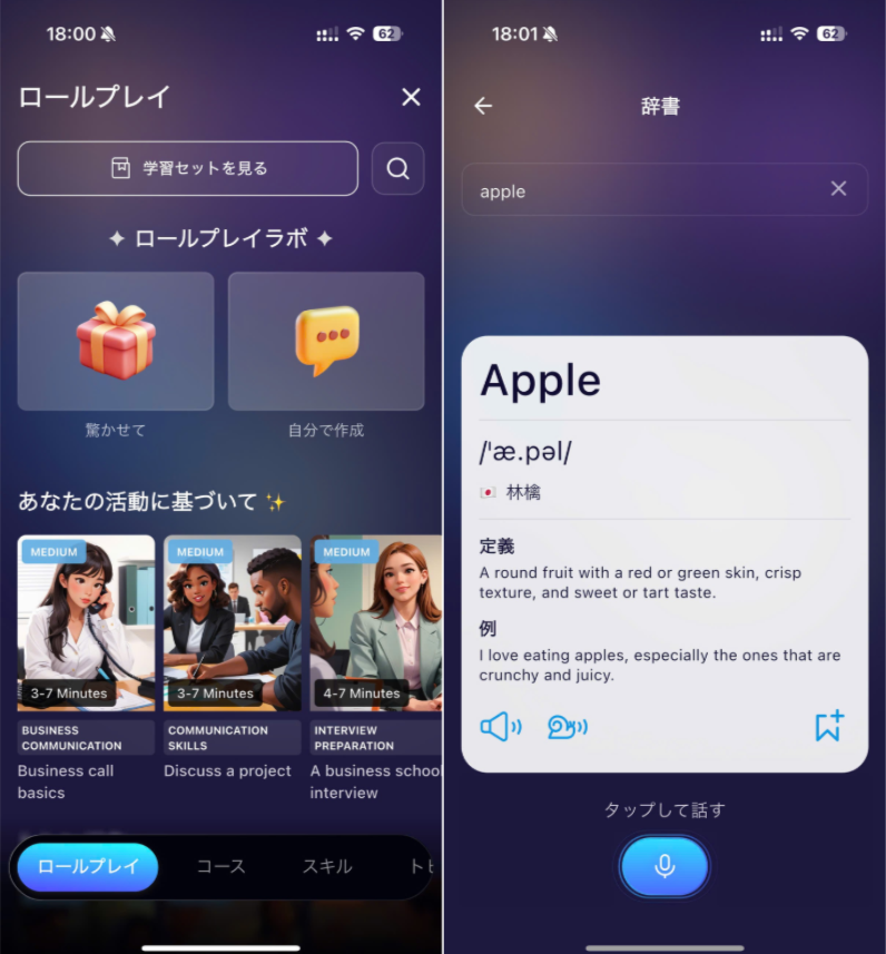 旧バージョンで人気の機能、例えば「発音矯正」「学習セット」、「辞書」、「リーダーボード」、「コース」、「トピック」なども、新バージョンで利用可能です。