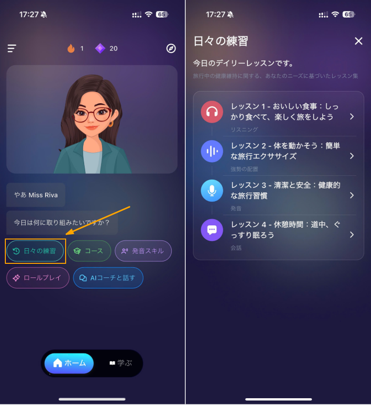日々の練習では、毎日割り当てられるさまざまなゲーム形式のレッスンを確認できます。レッスンを完了すると、各レッスンの平均スコアや、あなたの予測ネイティブレベルを確認できます。