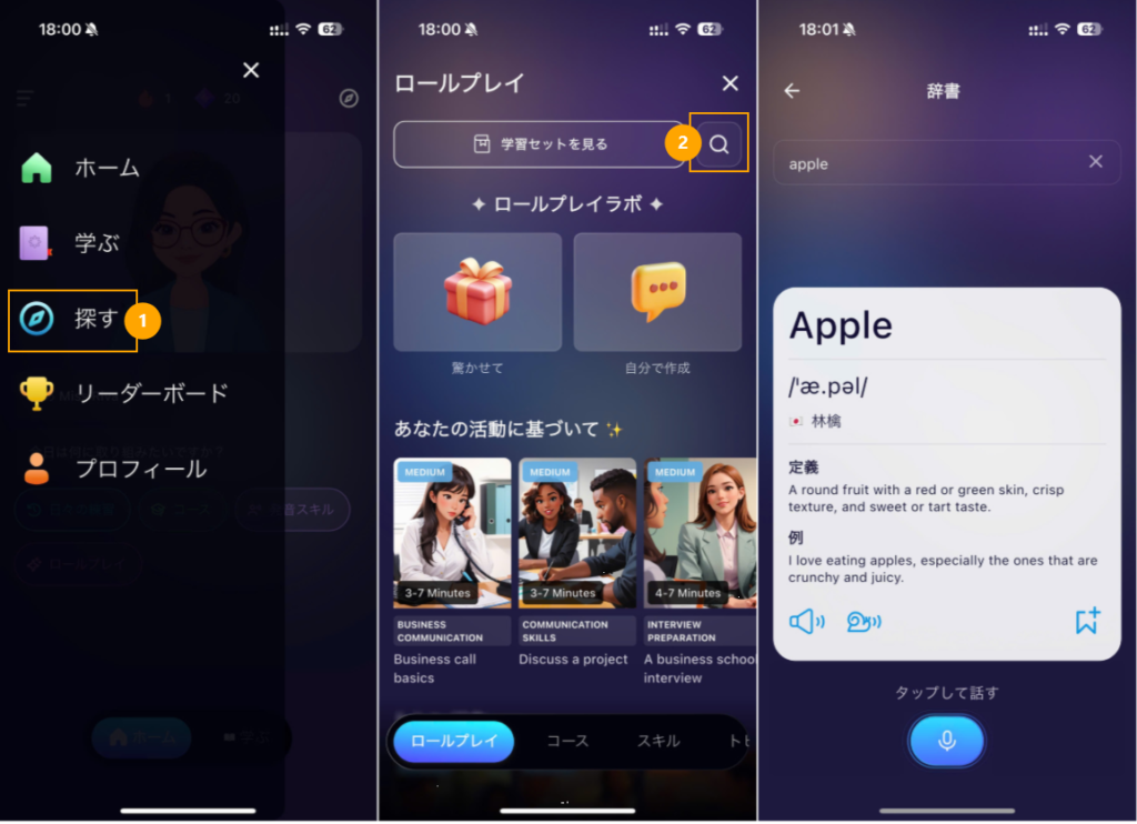 単語や文章の意味を調べたり、自分の発音を録音してフィードバックを受け取ることができます。