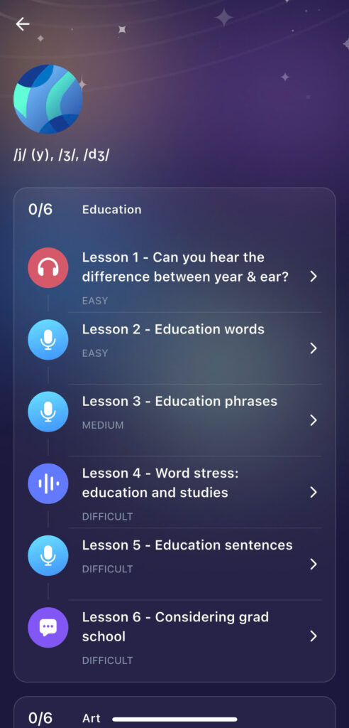 มีดาวเคราะห์ 19 ดวง ครอบคลุมทุกเสียงภาษาอังกฤษ เพื่อฝึกฝนการออกเสียงภาษาอังกฤษ. ดาวเคราะห์แต่ละดวงมีบทเรียนที่แตกต่างกันในเกมประเภทต่างๆ.