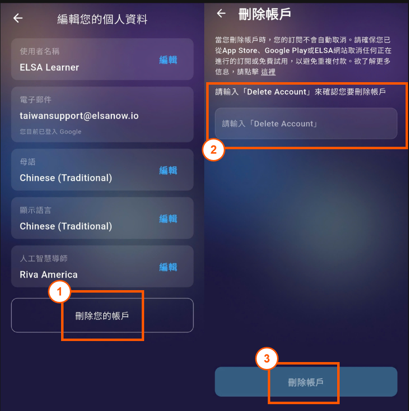 在刪除您的帳戶之前,請注意,刪除您的帳戶意味著刪除您在 ELSA 中的歷史記錄和學習進度,並且您將無法在將來再次檢索這些遺失的資料。