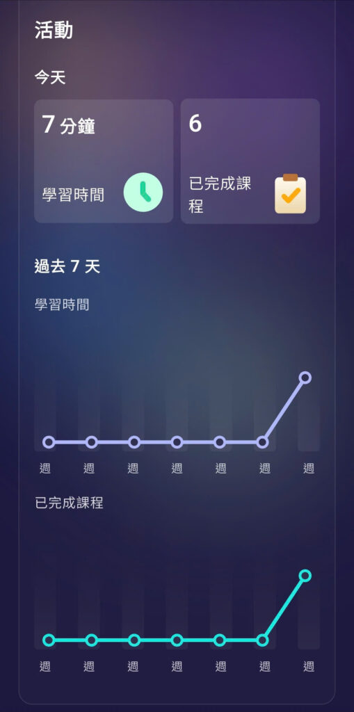 活動狀況(Activity):查看過去 7 天內的練習時長與完成的課程總數。