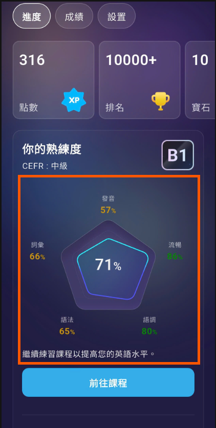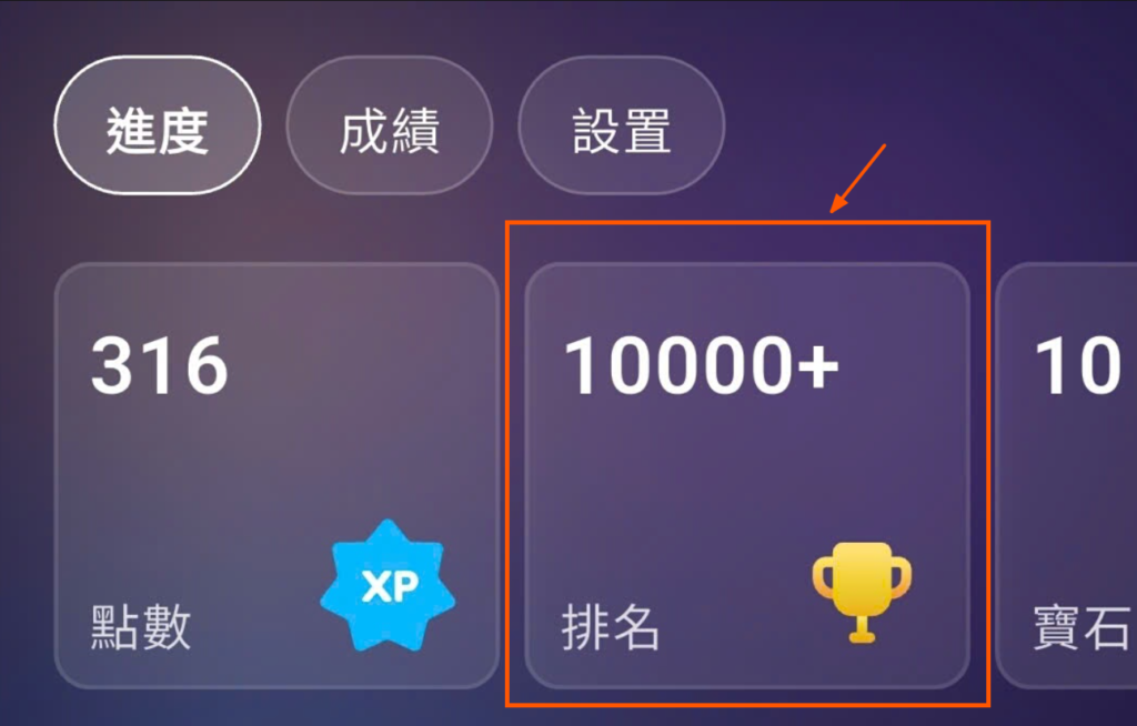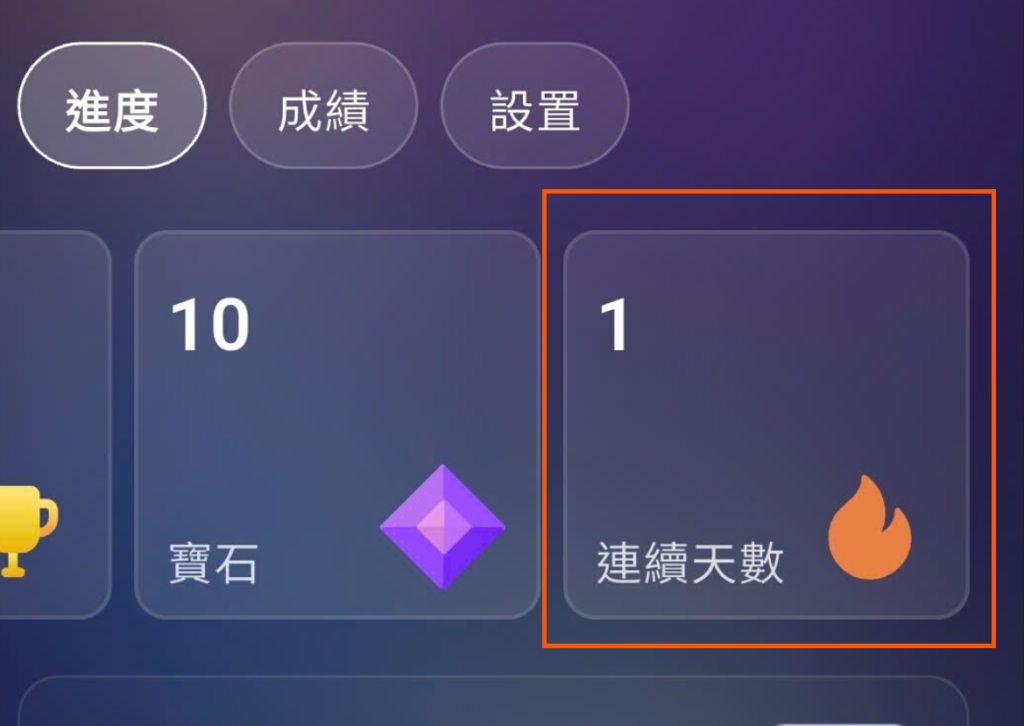 連續練習天數(Current Streak):每天至少完成一堂課以維持連續練習。連續天數越高,在每週排行榜上的積分越高。