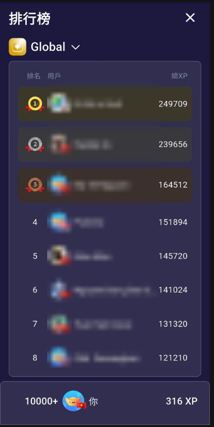 每週排行榜(Weekly Leaderboard):顯示你目前的排名與總XP(Total XP)